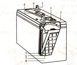 1一接線柱;2一蓋;3安全閥;4一防爆陶瓷過濾器;5正極板;6一隔板;7~負極板;8一外殼;9端子膠