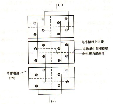 (4)閥控電池正常密封狀態,散熱較差。在浮充狀態電池內為負壓,所以電池槽壁要加厚,對2000~3000Ah電池槽的厚度有10mm以上。然而厚度越厚,熱容量越大,越難散熱,這樣將影響電池的電氣性能。因而有些制造廠采用分開槽的方法來分散槽壁負壓,以達到減薄壁厚便于散熱的目的。如將l000Ah電池分成兩格,2000~3000Ah電池分成四格。各槽格極板相互并聯,這樣2000~3000Ah槽厚可減至8~8.5mm。單體電池的電池槽采用分開方式,其串聯組合方式可用圖1-4表示。