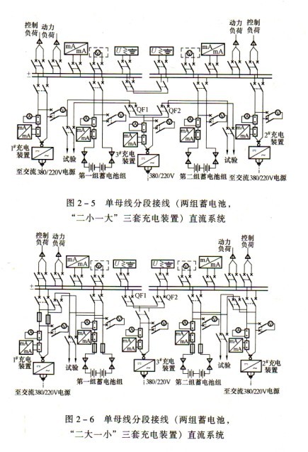 (5)方案五:?jiǎn)文妇€分段[兩組蓄電池,二小(1﹟2﹟充電裝置)一大(3﹟充電裝置)三套充電裝置,也可三套同容量]接線,見圖2-5。特點(diǎn):接線可靠、操作方便靈活。每段母線設(shè)一組蓄電池和一套充電裝置,另設(shè)一套公用充電裝置,可用于任一組蓄電池充電。公用充電裝置是分別經(jīng)空氣斷路器QFl、QF2接到任一組蓄電池回路,充電裝置為二小(工作充電裝置)一大(公用充電裝置),即小的充電裝置按浮充電要求設(shè)計(jì)小容量,大的充電裝置按均衡充電要求設(shè)計(jì)大容量。每段母